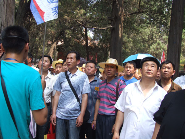 党员们在导游的带领下首先参观了世界文化遗产“三孔”——孔庙、孔府、孔林,观看了奎文阁、十三碑亭、杏坛、大成殿等标志建筑。整个孔府孔庙遍植成行的松柏,浓荫蔽日,创造出清心涤念的环境,而高耸挺拔的苍桧古柏间辟出一条幽深的通道,使我们深深的感到其历史的悠久和孔子思想的博大精深。 24日清晨,大家乘车来到中天门开始登泰山,看迎客松,走龙门,过升仙坊,登十八盘,至元忽必烈始建的南天门,逛天街,游碧霞祠。在这座历史名山中,深深的感受到了孔子“登泰山而小天下”的赞叹,登上玉皇顶,更是体会到杜甫“会当凌绝顶,一览众山小”的千古绝唱。从中天门到南天门的登山过程中,党员们进行了登山比赛,大家奋勇争先,最后毕国志获得了登山比赛的第一名,王文圣获得第二名,丛树成、夏民清同时到达南天门并列第三名。